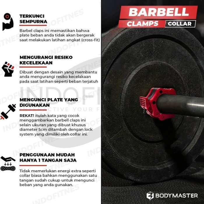 Pengunci untuk barbell atau dumbell yang berukuran standard olympic (5cm) dengan fitur mudah dipasang dan mudah dilepas, namun tetap sangat aman saat posisi terkunci.