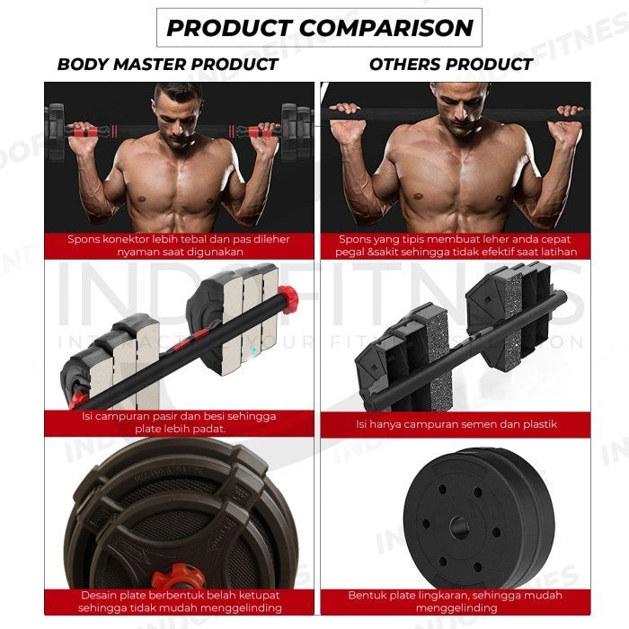 Adjustable dumbell 40kg multifungsi dari BODYMASTER, kualitas dumbell yang ini adalah yang premium, dengan material high quality PVC & NYLON awet berbeda dengan yang murah yang ada dipasaran, tidak mudah pecah.