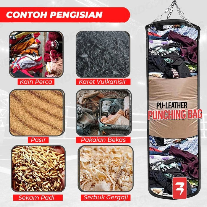 Agar menghemat ongkos kirim, samsak ini dijual tanpa isian, anda bisa mengisi nya sendiri di rumah, sesuai kebutuhan yang diperlukan, Contahnya menggunakan : Kain perca, Karet bekas vulkanisir, Pasir, atau isian latih sesuai dengan latihan dan target yang akan anda capai.