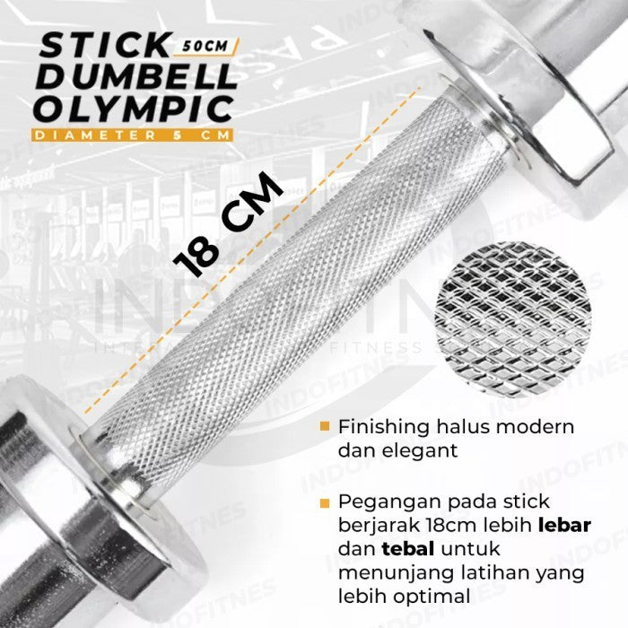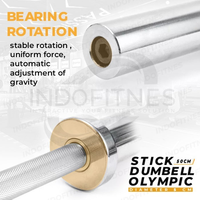 Stick bar untuk dumbell dengan kompatibiliti plate olympic (5cm), Dengan fitur bearing rotation, bagian yang ditempati plate dapat ikut berputar sehingga mampu menunjang kestabilan dan latihan lebih optimal.