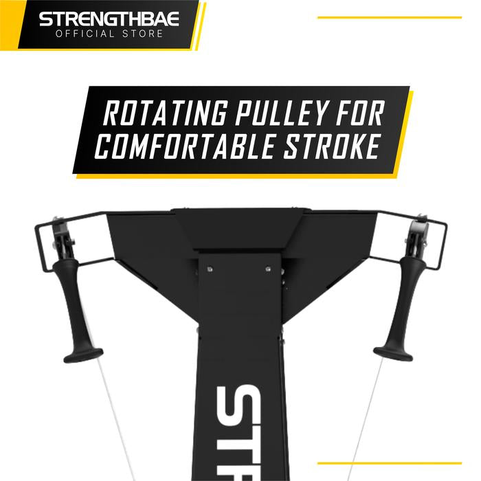 Pulley di area atas dapat berotasi kanan kiri sehingga ketika ditarik terasa smooth dan nyaman. Handle juga kualitas komersil, awet nyaman digenggam.